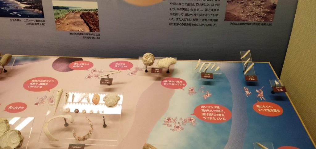 鬼界カルデラがあった奄美諸島でも人々がもどり、弥生時代が始まっても、貝や動物の骨を加工し、首飾り、腕輪などの装身具や狩りの道具として使用していました。